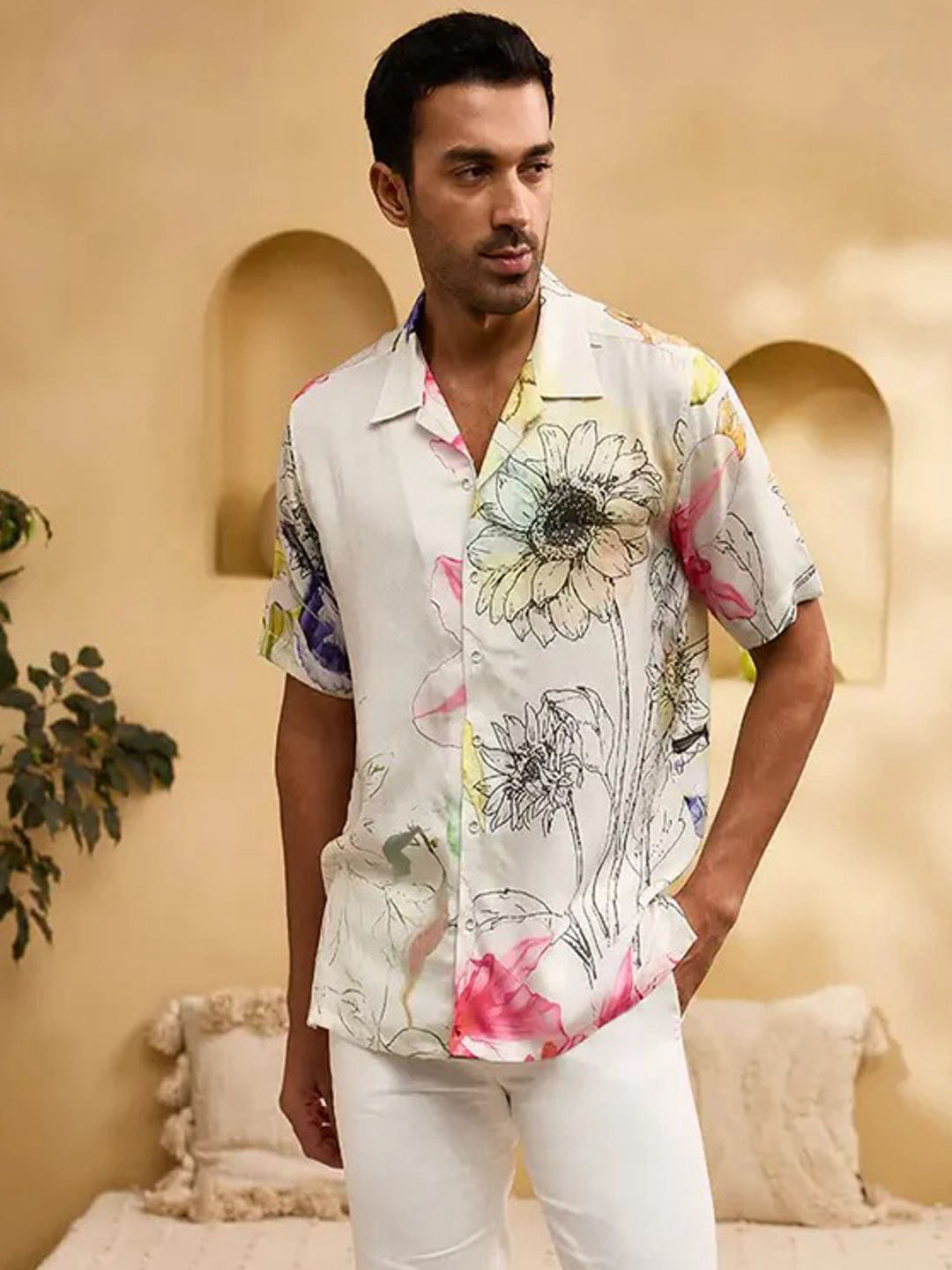 This off-white floral shirt is a versatile addition to your wardrobe, elevating your style with understated elegance.