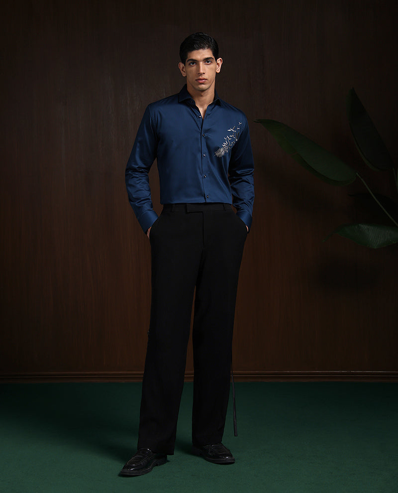 Navy Blue Slim Fit Cotton Shirt with Bold Contemporary Embroidery