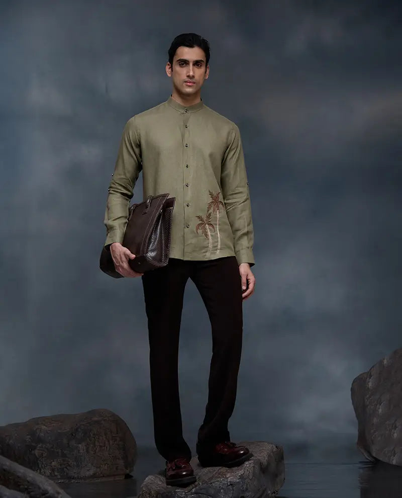 Olive Green Palm Tree Embroidered Linen Slim Fit Shirt