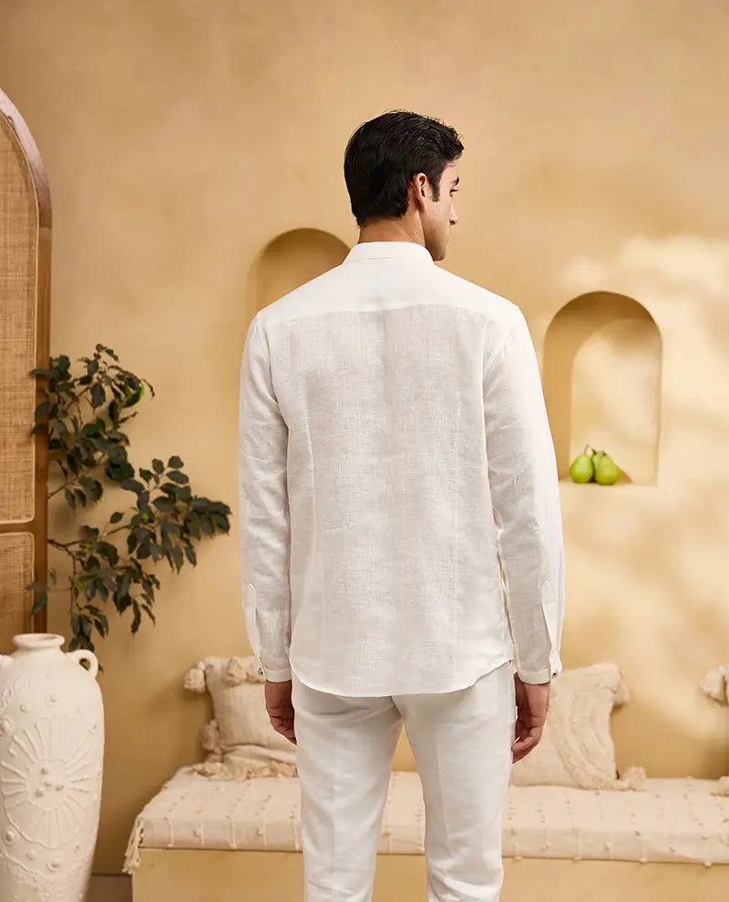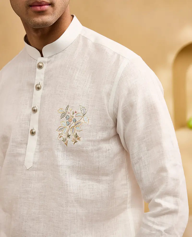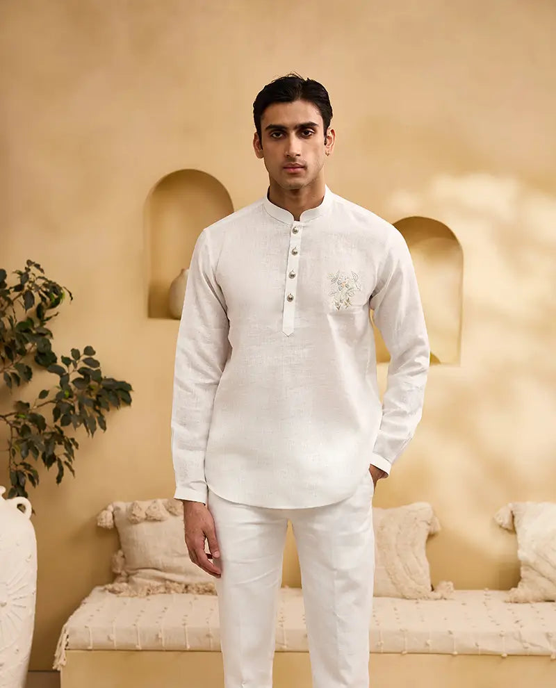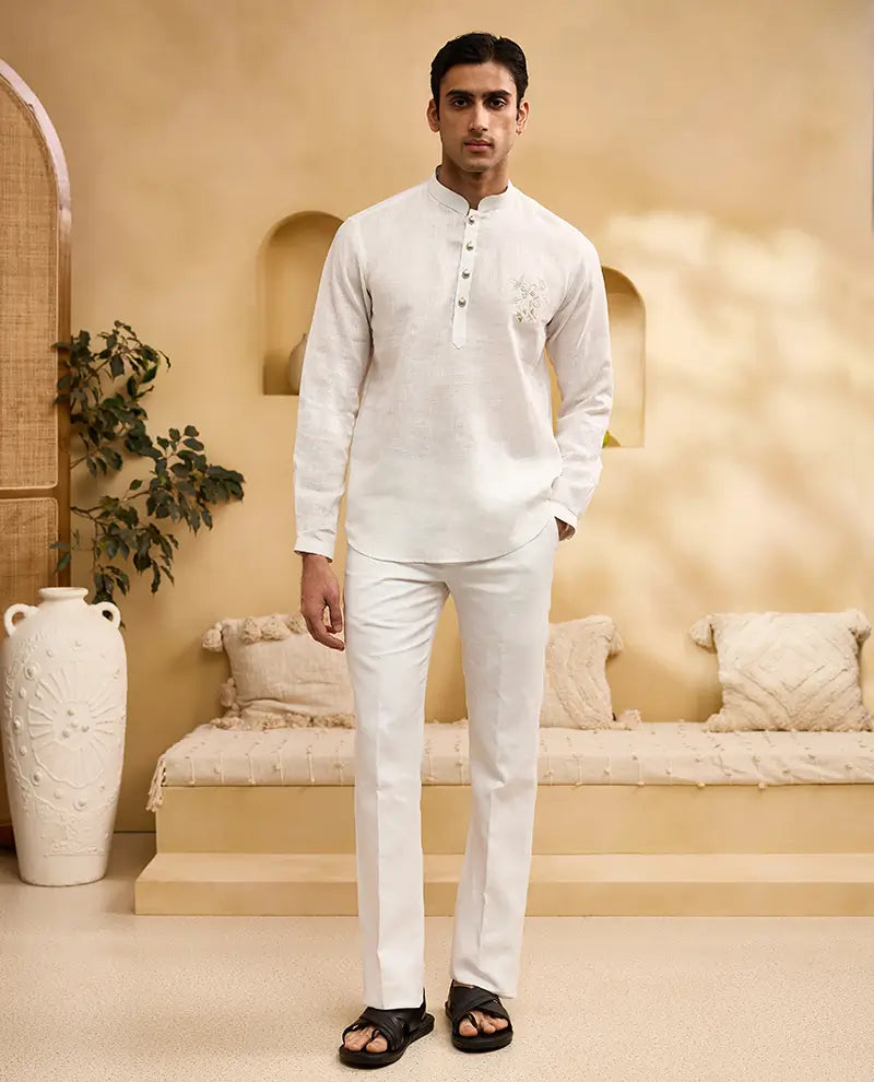 Experience timeless elegance with the Albino Lifestyle White Floral Motif Placement Embroidered Linen Kurti-Style Shirt. Crafted from premium linen, this shirt offers exceptional breathability and a relaxed, comfortable fit, ideal for warm weather. The exquisite floral motif placement embroidery adds a touch of artisanal grace, making each piece unique and sophisticated. The classic Chinese collar and full sleeves create a timeless and versatile look, perfect for both casual outings and special occasions. This kurti-style shirt effortlessly blends traditional Indian aesthetics with modern design, making it a statement piece for the discerning individual.