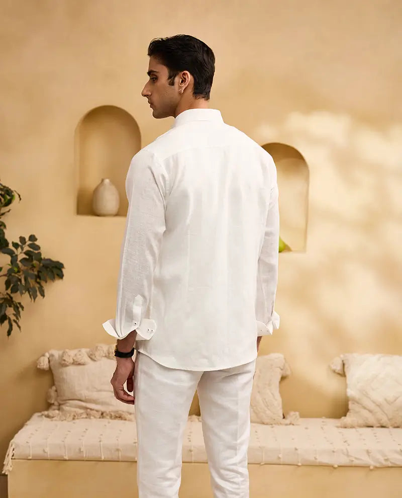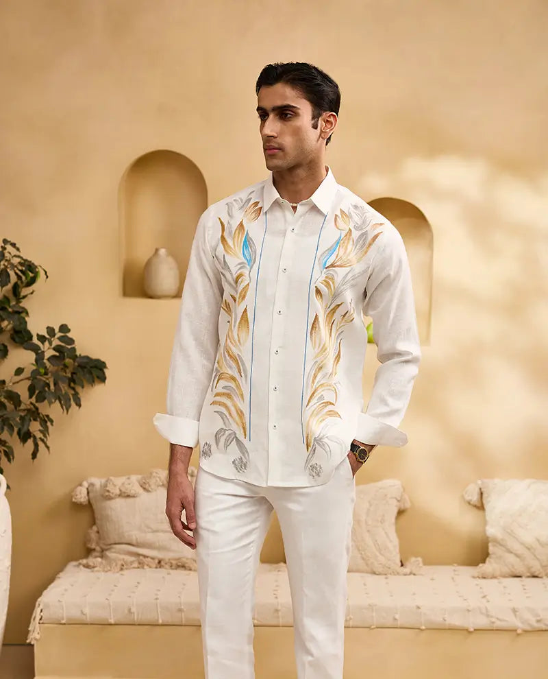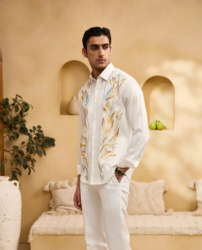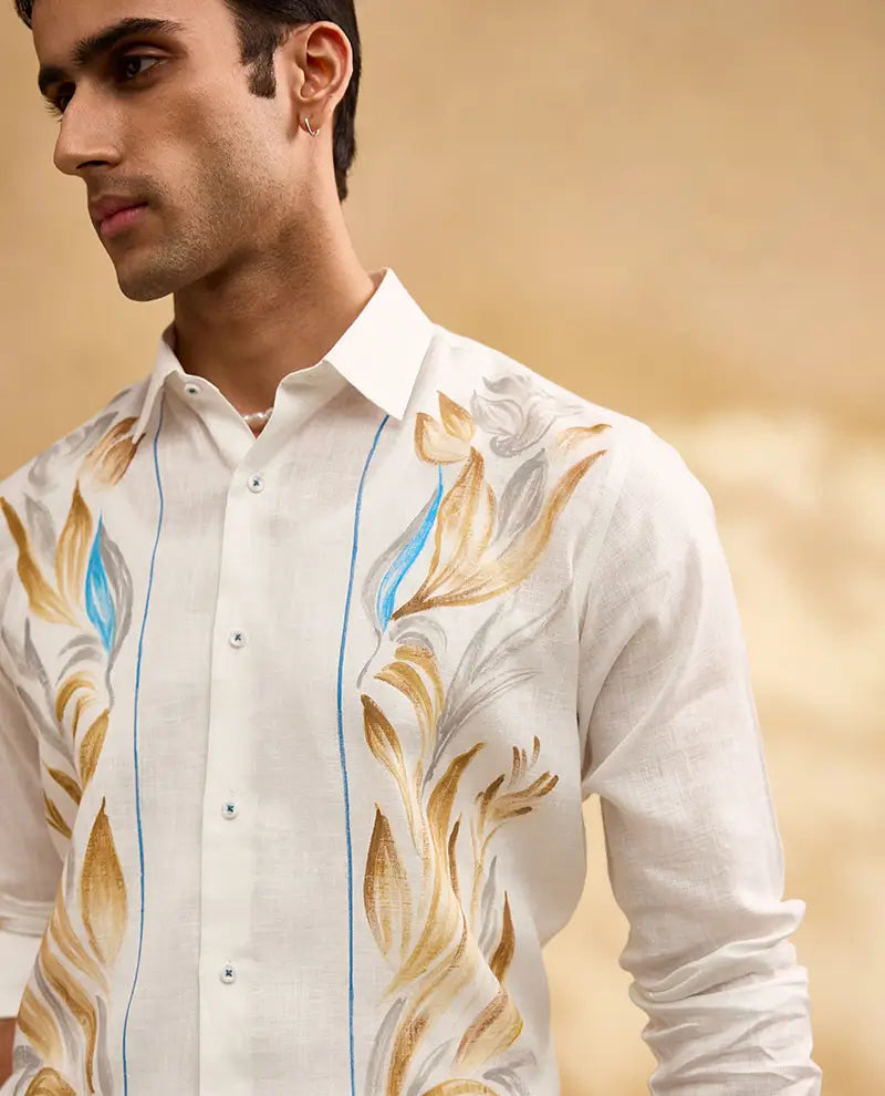 Embrace wearable art with the Albino Lifestyle White Hand-Painted Linen Slim Fit Shirt. This full-sleeve shirt, crafted from premium linen, offers a lightweight, breathable feel and a refined silhouette. The unique hand-painted design adds an artistic touch, making each piece a one-of-a-kind statement. Perfect for those who appreciate individuality and style, this shirt elevates any ensemble. The slim fit accentuates your physique, while the cutaway collar adds a touch of modern sophistication. Albino Lifestyle's commitment to quality ensures this hand-painted linen shirt is a distinctive addition to your wardrobe.