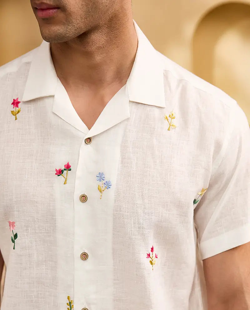 White with Coloured Minimal Floral Embroidery Linen Regular Fit Shirt